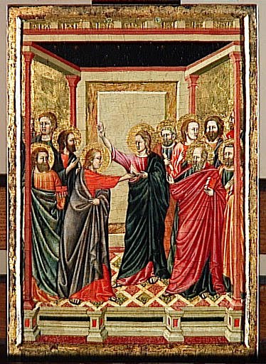 Pourtant, si Marie Madeleine découvre le ressuscité dans un jardin, les disciples apeurés le découvrent eux, dans une maison qu’ils ont transformée en un tombeau qu’ils ont refermé sur eux-mêmes. La nuit les environne et le lieu où ils se sont réfugiés est colmaté de l’intérieur pour les protéger contre tout danger pouvant venir du dehors. Pour eux le danger ne peut venir que de dehors et la sécurité ne peut être que dedans, même si ce dedans ressemble à une tombe, un lieu de néant et de déstructuration de l’individu. Nos protections humaines sont bien souvent dérisoires, mais nous avons confiance en elles. Pourtant, comme on va le voir, la vérité est tout autre. La vérité apparaît comme si les choses étaient inversées. La vie vient de l’extérieur que les apôtres redoutent tant, et la protection qu’ils se sont donnés ne peut que les enfermer dans la mort.